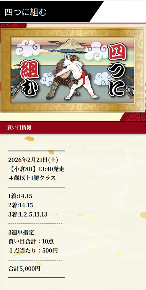今年の小倉はまじで荒れすぎ、開幕週のJRA中央競馬最高配当更新を見てから競馬予想サイトを使う用になり数週間に至ります。 その小倉予想で3人気⑭→7人気⑮→5人気⑤、上位人気総崩れのレース3連単万馬券を1点500円で的中の攻略に役立ちました。 500円×581.7倍=29万850円ゲットでした。的中報告です。