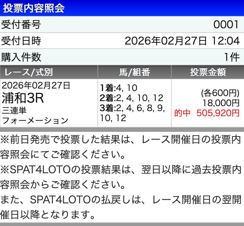 久しぶりに中山競馬場に遊びに行って中山記念生観戦でしたが、久々に日中から酒飲んでいて重賞前には4万負け状態… 一発狙ってセイウンハーデス流しで買って大ハズレ、背水の陣で挑んな中山最終で負けを取り返す大勝利で37万360円ゲット! これぞ人生の綱渡り!(笑)