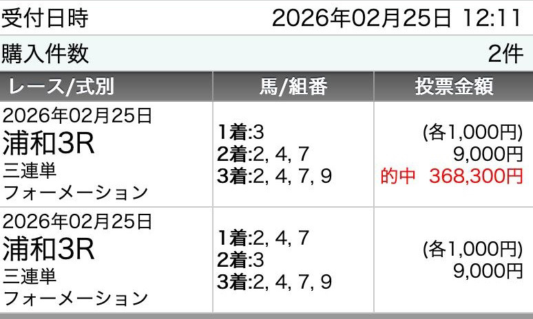 3連単にしては点数は多いけど、1点100円、点数60点、馬券代6千円で3連単4919.5倍当たるなら俺は全然ありだね、俺の師匠である競馬を教えてもらった友達に的中写メ自慢したら40万馬券なんて100点あっても足りない、絶対取れんって言ってた(笑) どんなに競馬歴が長くても使う予想サイトを間違えたら当たるものも当たらないよね、2026年、運命の競馬サイトと巡り合えました。