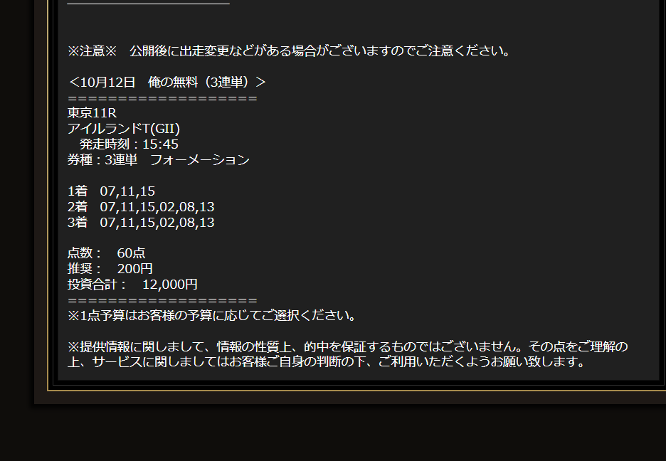 府中牝馬ステークスを引き継ぐ形の第一回アイルランドトロフィーを無料情報で3連単的中はお見事でした、全て推奨買い目、推奨馬券通り購入して 3連単 15-2-7 68,610円 229番人気 1点200円で137,220円払い戻し、馬券代引いても10万以上の利益でした、継続一択です。