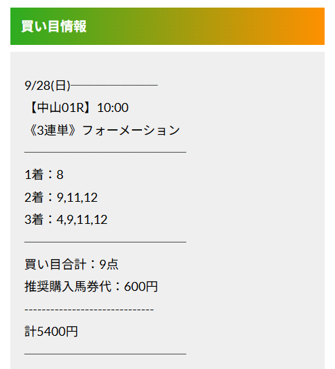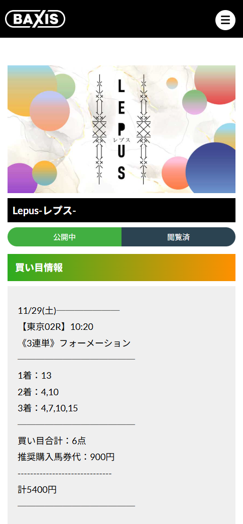 朝一から万馬券的中は痺れました! 馬券代も5400円で的中金額が212,580円でした 有馬記念までの資金集めが完了したのでバクシスさん使って更に稼げたらいいなと思っています。 利用回数がまだ浅いですが今のところ勝ち越しています