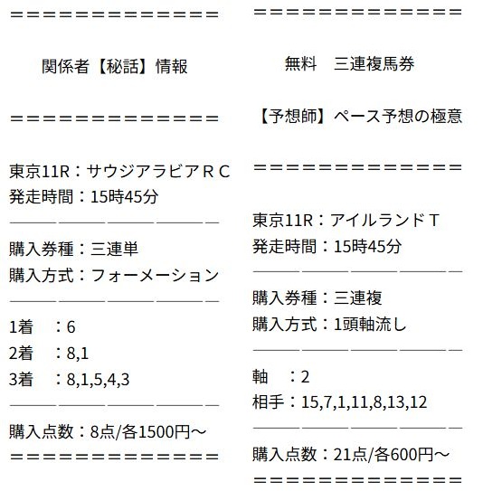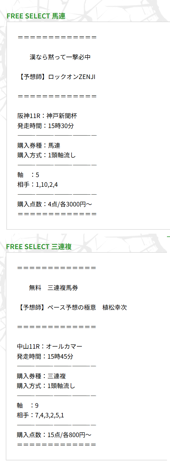 無料情報だったので3連単買い目ではなかったですが両レースとも当たっていました。