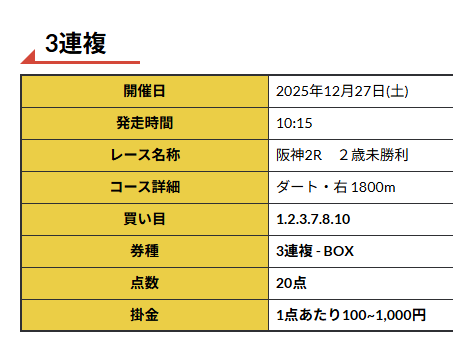 ここんとこ調子良さそうな競馬予想だったから使って良かったです、前回も10万越えだったような?!